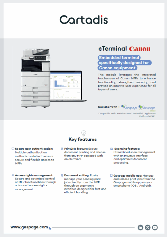 The Gespage eTerminal for Canon MFPs is a secure and user-friendly application that seamlessly integrates Canon multifunction devices, unlocking the power of Gespage through an embedded application at the device. Offering comprehensive access control, print2me (also called "pull-printing" or "secure print release"), the eTerminal helps you reduce costs, improve security, simplify print management, and reduce your environmental impact.