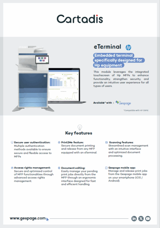 The Gespage eTerminal for HP MFPs is a secure and user-friendly application that seamlessly integrates HP multifunction devices, unlocking the power of Gespage through an embedded application at the device. Offering comprehensive access control, print2me (also called "pull-printing" or "secure print release"), the eTerminal helps you reduce costs, improve security, simplify print management, and reduce your environmental impact.