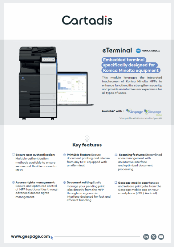 The Gespage eTerminal for Konica Minolta MFPs is a secure and user-friendly application that seamlessly integrates Konica Minolta multifunction devices, unlocking the power of Gespage through an embedded application at the device. Offering comprehensive access control, print2me (also called "pull-printing" or "secure print release"), the eTerminal helps you reduce costs, improve security, simplify print management, and reduce your environmental impact.