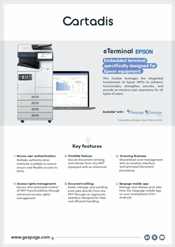 The Gespage eTerminal for Epson MFPs is a secure and user-friendly application that seamlessly integrates Epson multifunction devices, unlocking the power of Gespage through an embedded application at the device. Offering comprehensive access control, print2me (also called "pull-printing" or "secure print release"), the eTerminal helps you reduce costs, improve security, simplify print management, and reduce your environmental impact.