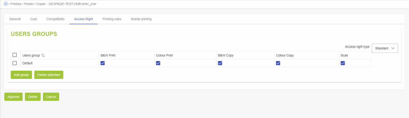 These rights regulate the access to the machines such as a right or not for copying, or printing in colour for a user group.