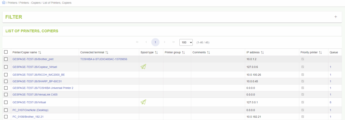The printer management works with a print server analysis, Gespage makes an automatic list of the queues, all printers on the server will be controlled by Gespage.
