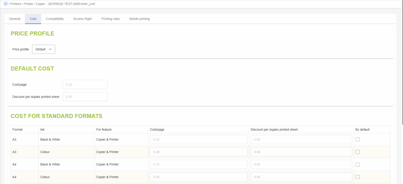Gespage allows you to manage the print budget by separating the different paper sizes as well as colour or black and white. Duplex can also be promoted by granting a Discount. Gespage can ensure monitoring of expenses related to scans. The tracers may be marked by a cost per m2 (calculated in multiples of A4 for pricing).