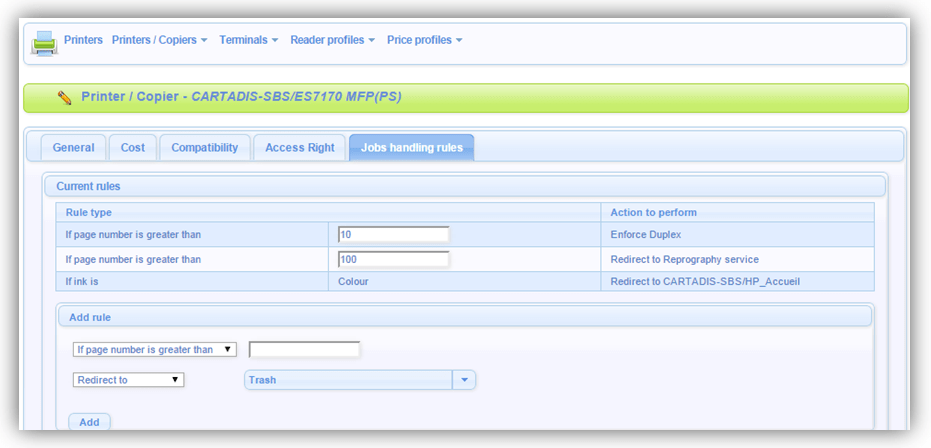 Redirection rules allow for example to route large documents to departmental printers or forbid printing of certain documents.